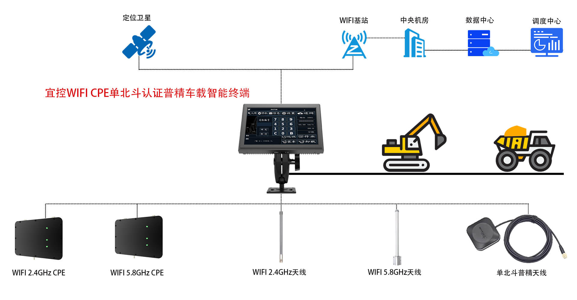矿⼭行业目前正在大力推进数字化矿山建设步伐,如何利用信息技术提升安全、作业效率、降低成本和减少污染成为核心关注点。宜控智能车载终端产品作为系统的车载数据中心,为操作手提供完整的车辆信息、调度信息、生产信息及驾驶辅助、防碰撞预警,显著提升安全性、减少油耗、提升生产效率。本方案主要解决矿山车辆现场的2.4GHZ,5.8GHZ WIFI连接稳定性、单北斗认证定位稳定性和现场耐候性等问题,保障系统稳定运行。